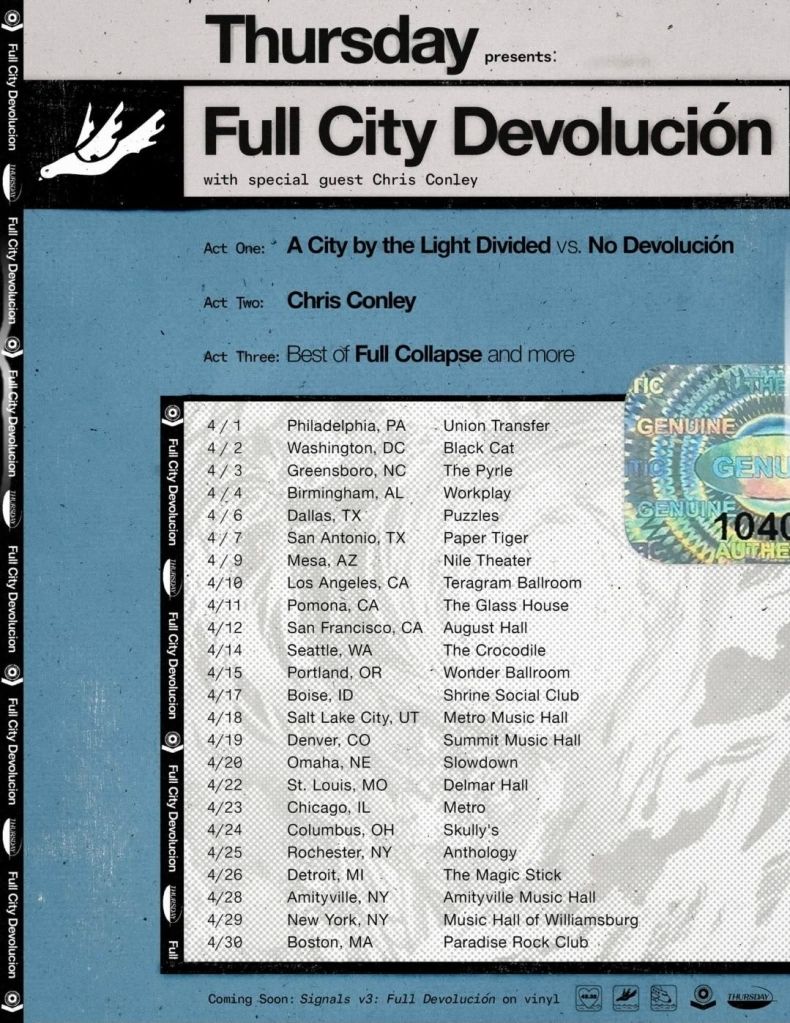 Thursday, a post-hardcore band that ruled the scene in the 2000s, has announced a spring run celebrating twenty years of their album A City by the Light Divided, fifteen of No Devolución, and twenty-five of Full Collapse. For this tour, they will be playing two sets each night, split by a performance by Chris Conley of Saves the Day. Tickets are on sale at thursday.net!