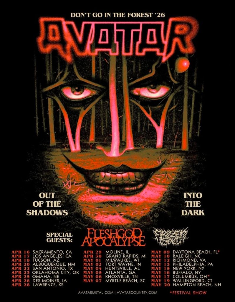 Swedish heavy metal outfit Avatar is kicking off the Don’t Go in the Forest Tour this April. This spring U.S. run boasts support from Fleshgod Apocalypse and Frozen Soul, and is making stops in Sacramento, Atlanta, Hampton Beach, and everywhere in between. Tickets are moving fast, so hurry to avatarmetal.com!