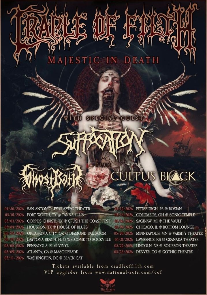 English metal heavyweights Cradle of Filth have announced the “Majestic in Death” tour. This spring U.S. run features special guests Suffocation, Ghost Bath, and Cultus Black. Tickets are available at cradleoffilth.com!