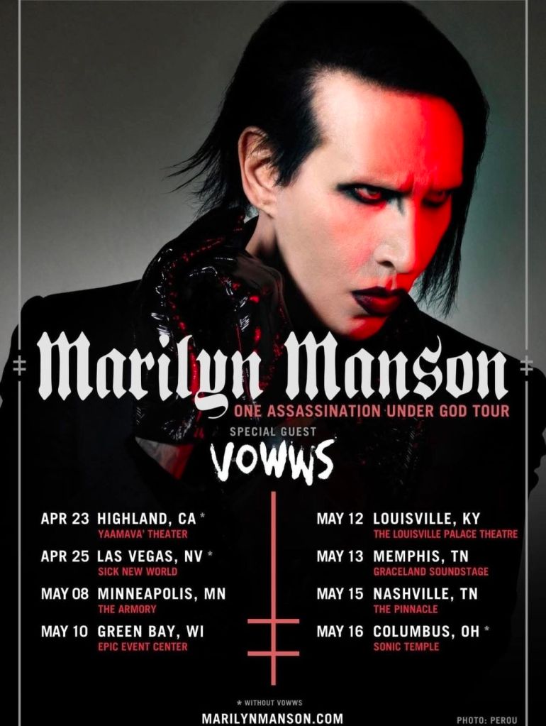 Infamous metal band Marilyn Manson has announced another leg of the “One Assassination Under God Tour.” This handful of spring dates will have Vowws as the opening act. Tickets are on sale at marilynmanson.com!