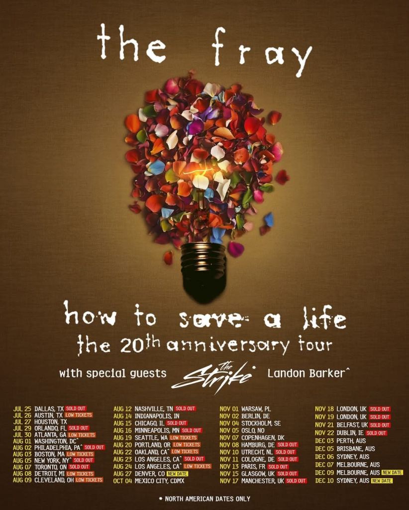 Pop/rock band The Fray is touring this year to celebrate 20 years of their debut record, How to Save a Life. With support from The Strike on their North American shows, and Landon Barker on select dates throughout, The Fray will be trekking across the globe from July to December. (There are a few festivals/fairs in September, but they are not included as part of this tour.)
