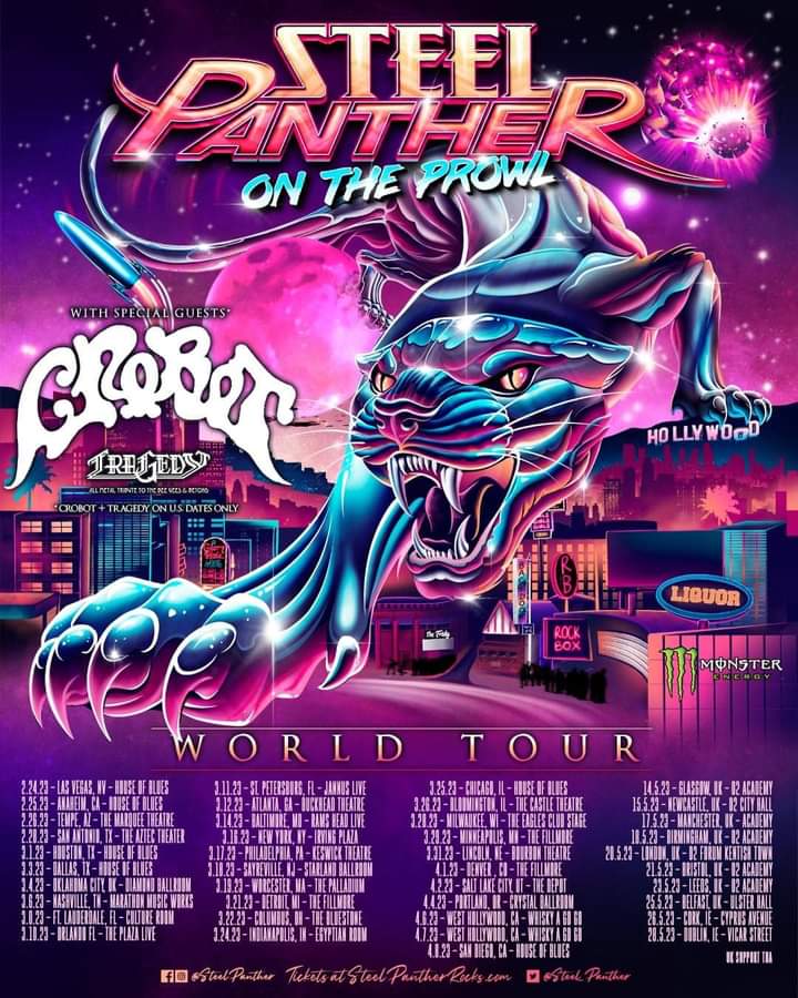 Steel Panther is about to set off on their On the Prowl World Tour. Crobot and Tragedy will be appearing at the U.S. shows, while Winger is the special guest for the May dates in the U.K. Tickets and VIP available at steelpantherrocks.com.