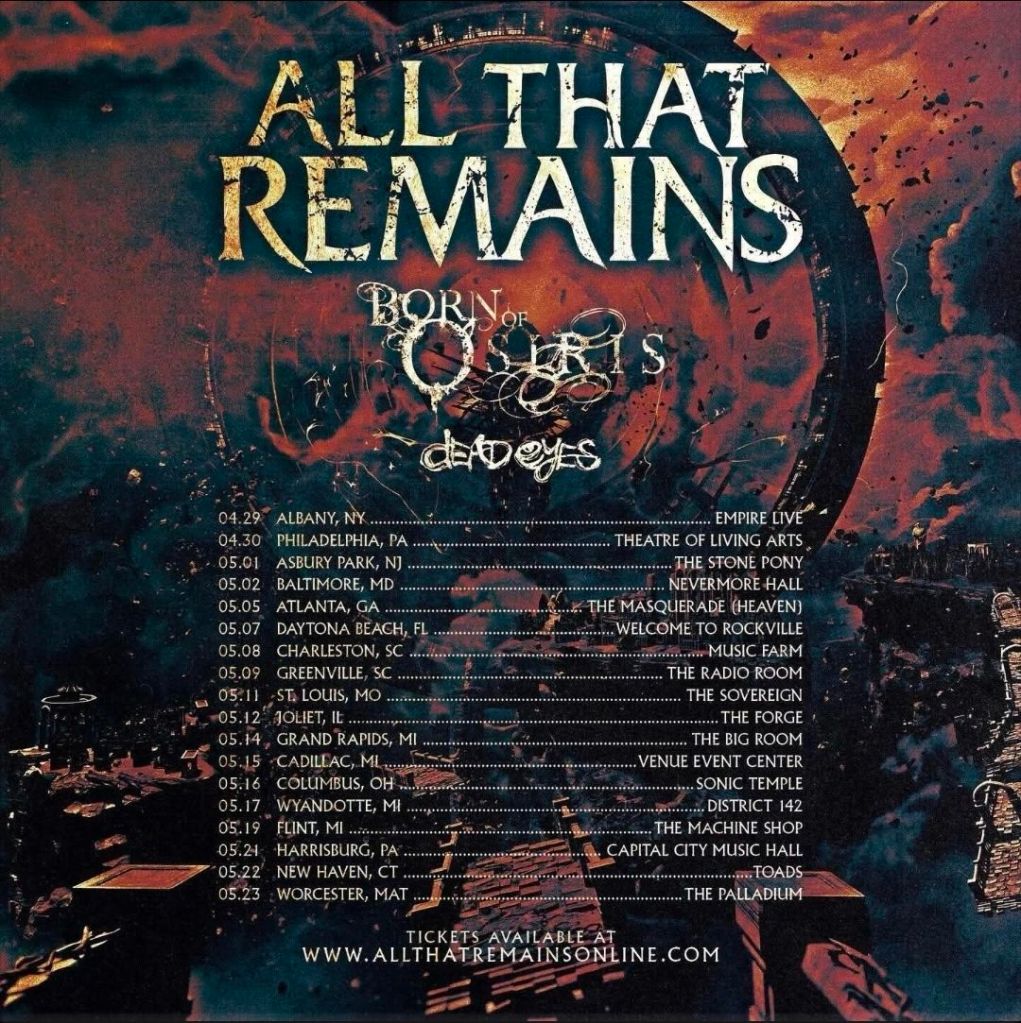 Metal band All That Remains has shared spring dates with Born of Osiris and Dead Eyes. The tour kicks off April 29th in Albany, New York. Tickets and VIP are available at allthatremainsonline.com!