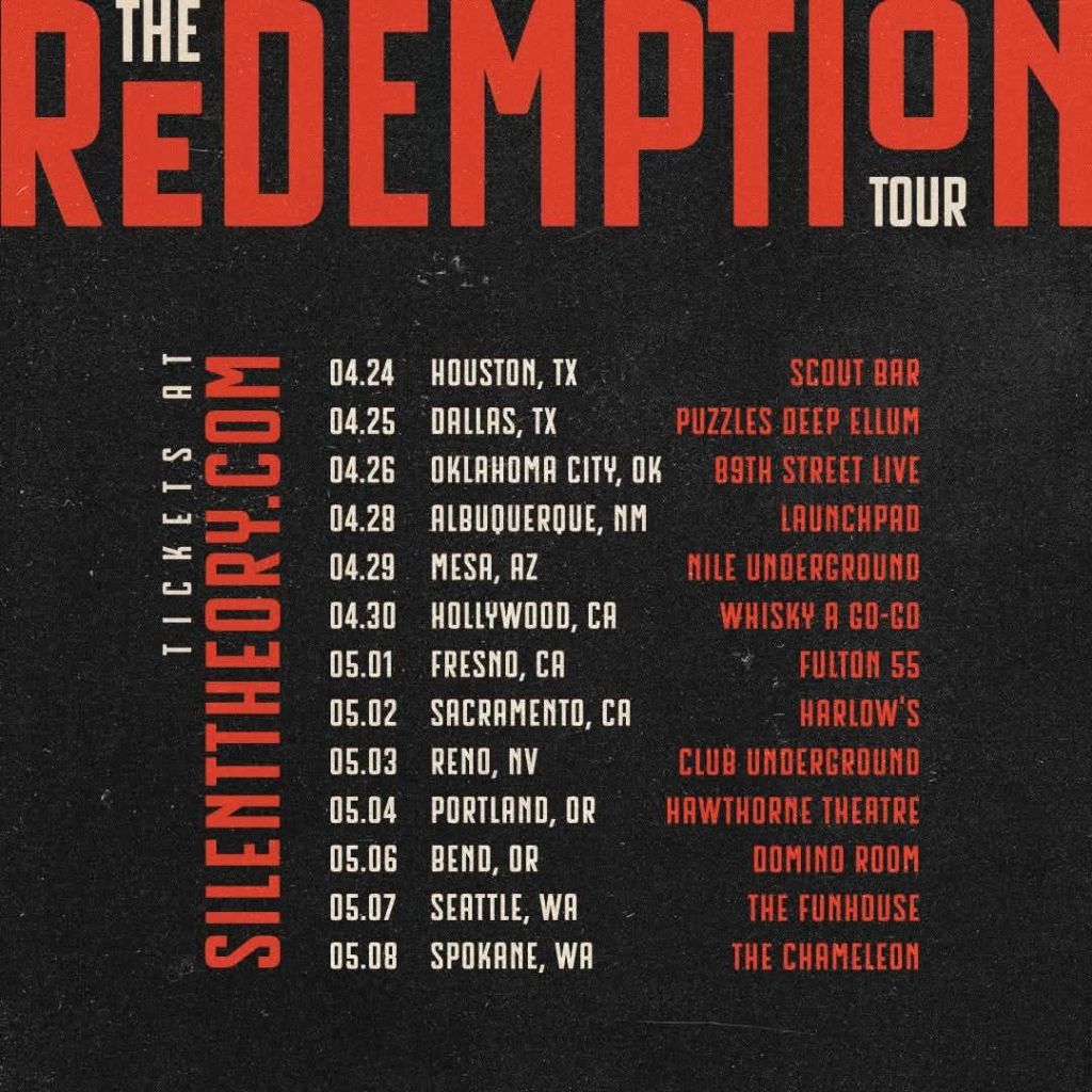 Alt-metal act Silent Theory will be on the road this spring alongside Ovtlier and Discrepancies. The Redemption Tour starts April 24th in Houston and will make stops in such cities as Albuquerque, Hollywood, and Portland before wrapping up on May 8th in Spokane. Tickets and VIP upgrades are available at silenttheory.com!